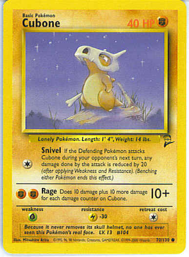 Evne [C] Snivel - If the Defending Pokemon attacks Cubone during your opponent's next turn, any damage done by the attack is reduced by 20 (after applying Weakness and Resistance). (Benching either Pokemon ends this effect.)