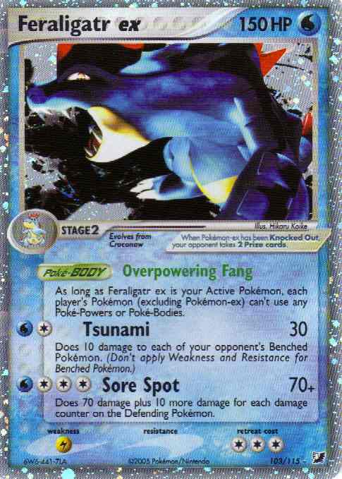 Type | Water | Pokemon serie | Unseen Forces | Stadie | Stage 2 | HP | 150 | Sjældenhed | Ultra-Rare | Tilbagetrækning | 3 | Svaghed | L | Kortnummer | 103 | Evne | [CW] Tsunami (30) Does 10 damage to each of your opponent's Benched Pokemon. (Don't apply Weakness and Resistance for Benched Pokemon.) [CCCW] Sore Sport (70+) Does 70 damage plus 10 more damage for each damage counter on the Defending Pokemon. | Evne2 | [CW] Tsunami (30) Does 10 damage to each of your opponent's Benched Pokemon. (Don't apply Weakness and Resistance for Benched Pokemon.) [CCCW] Sore Sport (70+) Does 70 damage plus 10 more damage for each damage counter on the Defending Pokemon. | Kunstner | Hikaru Koike |