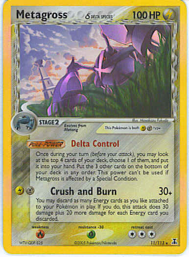 Type | Metal Lightning | Pokemon serie | Delta Species | Stadie | Stage 2 | HP | 100 | Sjældenhed | Rare | Tilbagetrækning | 3 | Modstand | G | Svaghed | R | Kortnummer | 11 | Evne |