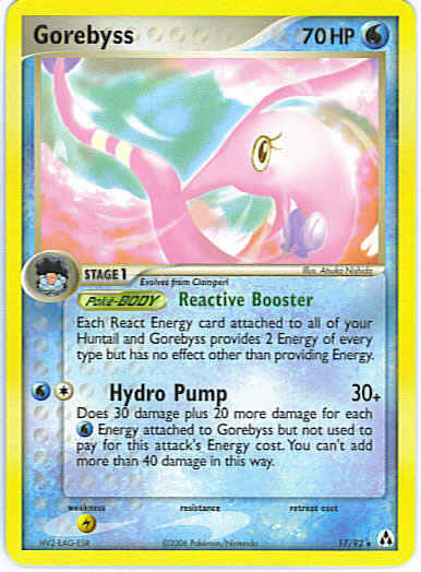 [CW] Hydro Pump (30+) Does 30 damage plus 20 more damage for each W Energy attached to Gorebyss but not used to pay for this attack's Energy cost. You can't add more than 40 damage in this way.