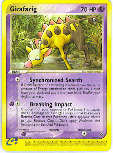 Type | Psychic | Pokemon serie | Dragon | Stadie | Basic | HP | 70 | Sjældenhed | Rare | Tilbagetrækning | 1 | Svaghed | P | Kortnummer | 16 | Evne | [C] Synchronized Search - If Girafarig and the Defending Pokemon have the same amount of Energy attached to them, pick any 1 card from your deck and put it into your hand. Shuffle your deck afterward. [CP] Breaking Impact - Choose 1 of your opponent's Pokemon. This attack does 10 damage for each 1 Energy in that Pokemon's Retreat Cost to that Pokemon (after applying effects to the Retreat Cost). (Don't apply Weakness and Resistance for Benched Pokemon.) | Evne2 | [C] Synchronized Search - If Girafarig and the Defending Pokemon have the same amount of Energy attached to them, pick any 1 card from your deck and put it into your hand. Shuffle your deck afterward. [CP] Breaking Impact - Choose 1 of your opponent's Pokemon. This attack does 10 damage for each 1 Energy in that Pokemon's Retreat Cost to that Pokemon (after applying effects to the Retreat Cost). (Don't apply Weakness and Resistance for Benched Pokemon.) | Kunstner | Midori Harada |