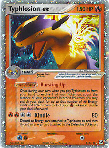 Type | Fire | Pokemon serie | Unseen Forces | Stadie | Stage 2 | HP | 150 | Sjældenhed | Ultra-Rare | Tilbagetrækning | 1 | Svaghed | WF | Kortnummer | 110 | Evne | [CCRR] Kindle (80) Discard an Energy card attach to Typhlosion EX and then discard an Energy card attached to the Defending Pokemon. | Evne2 | [CCRR] Kindle (80) Discard an Energy card attach to Typhlosion EX and then discard an Energy card attached to the Defending Pokemon. | Kunstner | Mitsuhiro Arita |