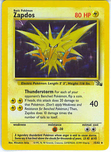 Type | Lightning | Pokemon serie | Fossil | Stadie | Basic | HP | 80 | Sjældenhed | Rare | Tilbagetrækning | 2 | Modstand | F | Kortnummer | 15 | Evne |