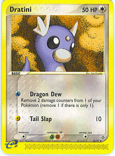 Type | Colorless | Pokemon serie | Dragon | Stadie | Basic | HP | 50 | Sjældenhed | Uncommon | Tilbagetrækning | 1 | Modstand | FG | Svaghed | C | Kortnummer | 26 | Evne | [W] Dragon Dew - Remove 2 damage counters from 1 of your Pokemon (remove 1 if there is only 1). [L] Tail Slap (10) | Evne2 | [W] Dragon Dew - Remove 2 damage counters from 1 of your Pokemon (remove 1 if there is only 1). [L] Tail Slap (10) | Kunstner | Aya Kusube |