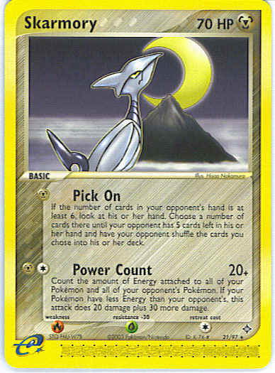 Type | Metal | Pokemon serie | Dragon | Stadie | Basic | HP | 70 | Sjældenhed | Rare | Tilbagetrækning | 1 | Modstand | G | Svaghed | R | Kortnummer | 21 | Evne | [M] Pick On - If the number of cards in your opponent's hand is at least 6, look at his or her hand. Choose a number of cards there until your opponent has 5 cards left in his or her hand and have your opponent shuffle the cards you chose into his or her deck. [CM] Power Count (20+) Count the amount of Energy attached to all of your Pokemon and all of your opponent's Pokemon. If your Pokemon have less Energy than your opponent's, this attack does 20 damage plus 30 more damage. | Evne2 | [M] Pick On - If the number of cards in your opponent's hand is at least 6, look at his or her hand. Choose a number of cards there until your opponent has 5 cards left in his or her hand and have your opponent shuffle the cards you chose into his or her deck. [CM] Power Count (20+) Count the amount of Energy attached to all of your Pokemon and all of your opponent's Pokemon. If your Pokemon have less Energy than your opponent's, this attack does 20 damage plus 30 more damage. | Kunstner | Hisao Nakamura |