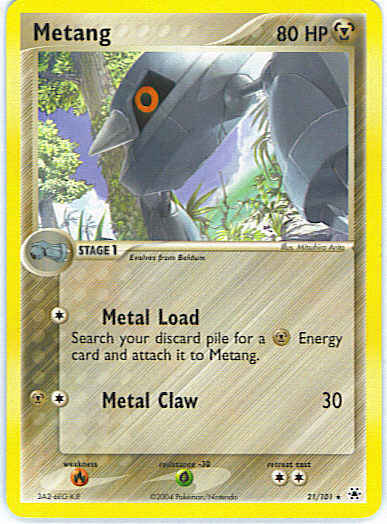 Type | Metal | Pokemon serie | Hidden Legends | Stadie | Stage 1 | HP | 80 | Sjældenhed | Rare | Tilbagetrækning | 2 | Modstand | G | Svaghed | R | Kortnummer | 21 | Evne | [C] Metal Load - Search your discard pile for a M Energy card and attach it to Metang. [CM] Metal Claw (30) | Evne2 | [C] Metal Load - Search your discard pile for a M Energy card and attach it to Metang. [CM] Metal Claw (30) | Kunstner | Mitsuhiro Arita |