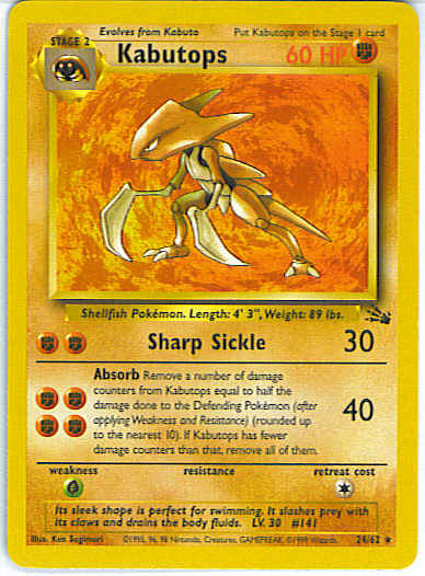 [FFFF] Absorb (40) Remove a number of damage counters from Kabutops equal to half the damage done to Defending Pokemon (after applying Weakness and Resistance) (rounded up to the nearest 10). If Kabutops has fewer damage counters than that, remove all of them.