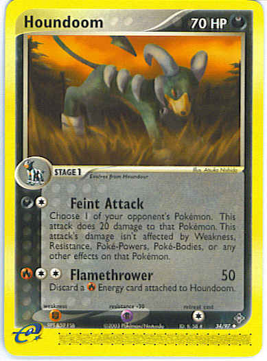Type | Darkness | Pokemon serie | Dragon | Stadie | Stage 1 | HP | 70 | Sjældenhed | Uncommon | Tilbagetrækning | 1 | Modstand | P | Svaghed | F | Kortnummer | 34 | Evne | [CD] Feint Attack - Choose 1 of your opponent's Pokemon. This attack does 20 damage to that Pokemon. This attack's damage isn't affected by Weakness, Resistance, Poke-Powers, Poke-Bodies, or any other effects on that Pokemon. [CCR] Flamethrower (50) Discard a R Energy card attached to Houndoom. | Evne2 | [CD] Feint Attack - Choose 1 of your opponent's Pokemon. This attack does 20 damage to that Pokemon. This attack's damage isn't affected by Weakness, Resistance, Poke-Powers, Poke-Bodies, or any other effects on that Pokemon. [CCR] Flamethrower (50) Discard a R Energy card attached to Houndoom. | Kunstner | Atsuko Nishida |