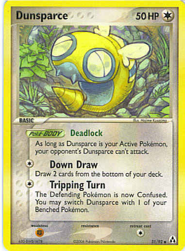 Type | Colorless | Pokemon serie | Legend Maker | Stadie | Basic | HP | 50 | Sjældenhed | Uncommon | Tilbagetrækning | 1 | Svaghed | F | Kortnummer | 31 | Evne | [C] Down Draw - Draw 2 cards from the bottom of your deck. [C] Tripping Turn - The Defending Pokemon is now Confused. You may switch Dunspace with 1 of your Benched Pokemon. | Evne2 | [C] Down Draw - Draw 2 cards from the bottom of your deck. [C] Tripping Turn - The Defending Pokemon is now Confused. You may switch Dunspace with 1 of your Benched Pokemon. | Kunstner | Hajime Kusajima |