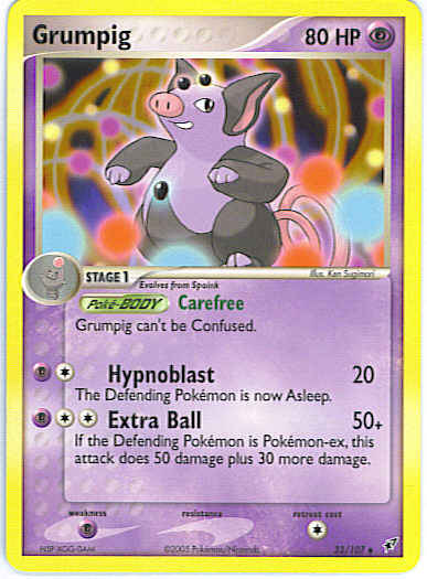 Type | Psychic | Pokemon serie | Deoxys | Stadie | Stage 1 | HP | 80 | Sjældenhed | Uncommon | Tilbagetrækning | 1 | Svaghed | P | Kortnummer | 32 | Evne | [CP] Hypnoblast (20) The Defending Pokemon is now Asleep. [CCP] Extra Ball (50+) If the Defending Pokemon is Pokemon-ex, this attack does 50 damage plus 30 more damage. | Evne2 | [CP] Hypnoblast (20) The Defending Pokemon is now Asleep. [CCP] Extra Ball (50+) If the Defending Pokemon is Pokemon-ex, this attack does 50 damage plus 30 more damage. | Kunstner | Ken Sugimori |
