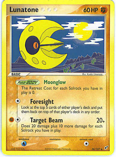 Type | Fighting | Pokemon serie | Deoxys | Stadie | Basic | HP | 60 | Sjældenhed | Uncommon | Tilbagetrækning | 1 | Svaghed | W | Kortnummer | 36 | Evne | [C] Foresight - Look at the top 5 cards of either player's deck and put them back on top of that player's deck in any order. [CF] Target Beam (20+) Does 20 damage plus 10 more damage for each Solrock you have in play. | Evne2 | [C] Foresight - Look at the top 5 cards of either player's deck and put them back on top of that player's deck in any order. [CF] Target Beam (20+) Does 20 damage plus 10 more damage for each Solrock you have in play. | Kunstner | Kyoko Umemoto |