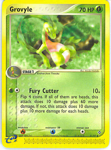 Type | Grass | Pokemon serie | Dragon | Stadie | Stage 1 | HP | 70 | Sjældenhed | Uncommon | Tilbagetrækning | 1 | Modstand | W | Svaghed | R | Kortnummer | 31 | Evne | [CG] Fury Cutter (10+) Flip 4 coins. If all of them are heads, this attack does 10 damage plus 60 more damage. If not, this attack does 10 damage plus 10 more damage for each heads. | Evne2 | [CG] Fury Cutter (10+) Flip 4 coins. If all of them are heads, this attack does 10 damage plus 60 more damage. If not, this attack does 10 damage plus 10 more damage for each heads. | Kunstner | Atsuko Nishida |