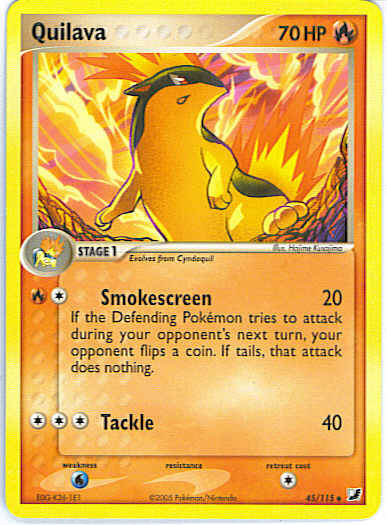 Type | Fire | Pokemon serie | Unseen Forces | Stadie | Stage 1 | HP | 70 | Sjældenhed | Uncommon | Tilbagetrækning | 1 | Svaghed | W | Kortnummer | 45 | Evne | [CR] Smokescreen (20) If the Defending Pokemon tries to attack during your opponent's next turn, your opponent flips a coin. If tails, that attack does nothing. [CCC] Tackle (40) | Evne2 | [CR] Smokescreen (20) If the Defending Pokemon tries to attack during your opponent's next turn, your opponent flips a coin. If tails, that attack does nothing. [CCC] Tackle (40) | Kunstner | Hajime Kusajima |