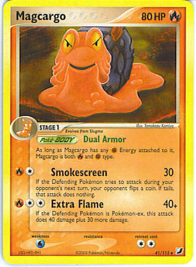 Type | Fire | Pokemon serie | Unseen Forces | Stadie | Stage 1 | HP | 80 | Sjældenhed | Uncommon | Tilbagetrækning | 2 | Svaghed | W | Kortnummer | 41 | Evne | [CR] Smokescreen (30) If the Defending Pokemon tries to attack during your opponent's next turn, your opponent flips a coin. If tails, that attack does nothing. [CCR] Extra Flame (40+) If the Defending Pokemon is Pokemon-ex, this attack does 40 damage plus 30 more damage. | Evne2 | [CR] Smokescreen (30) If the Defending Pokemon tries to attack during your opponent's next turn, your opponent flips a coin. If tails, that attack does nothing. [CCR] Extra Flame (40+) If the Defending Pokemon is Pokemon-ex, this attack does 40 damage plus 30 more damage. | Kunstner | Tomokazu Komiya |