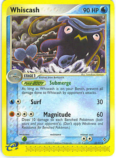 Type | Water | Pokemon serie | Dragon | Stadie | Stage 1 | HP | 90 | Sjældenhed | Uncommon | Tilbagetrækning | 2 | Svaghed | G | Kortnummer | 48 | Evne | [CW] Surf (30) [CCCF] Magnitude (60) Does 10 damage to each Benched Pokemon (both yours and your opponent's). (Don't apply Weakness and Resistance for Benched Pokemon.) | Evne2 | [CW] Surf (30) [CCCF] Magnitude (60) Does 10 damage to each Benched Pokemon (both yours and your opponent's). (Don't apply Weakness and Resistance for Benched Pokemon.) | Kunstner | Tomokazu Komiya |