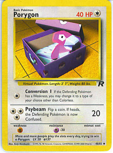Type | Colorless | Pokemon serie | Team Rocket | Stadie | Basic | HP | 40 | Sjældenhed | Uncommon | Tilbagetrækning | 3 | Modstand | P | Svaghed | F | Kortnummer | 48 | Evne |