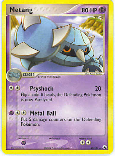 Type | Psychic | Pokemon serie | Hidden Legends | Stadie | Stage 1 | HP | 80 | Sjældenhed | Uncommon | Tilbagetrækning | 2 | Svaghed | P | Kortnummer | 43 | Evne | [CC] Psyshock (20) Flip a coin. If heads, the Defending Pokemon is now Paralyzed. [CCP] Metal Ball - Put 5 damage counters on the Defending Pokemon. | Evne2 | [CC] Psyshock (20) Flip a coin. If heads, the Defending Pokemon is now Paralyzed. [CCP] Metal Ball - Put 5 damage counters on the Defending Pokemon. | Kunstner | Kouki Saitou |