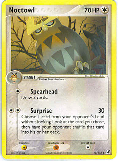 Type | Colorless | Pokemon serie | Unseen Forces | Stadie | Stage 1 | HP | 70 | Sjældenhed | Uncommon | Tilbagetrækning | 1 | Modstand | F | Svaghed | L | Kortnummer | 43 | Evne | [C] Spearhead - Draw 3 cards. [CC] Surprise (30) Choose 1 card from your opponent's hand without looking. Look at the card you chose, then have your opponent shuffle that card into his or her deck. | Evne2 | [C] Spearhead - Draw 3 cards. [CC] Surprise (30) Choose 1 card from your opponent's hand without looking. Look at the card you chose, then have your opponent shuffle that card into his or her deck. | Kunstner | Mitsuhiro Arita |