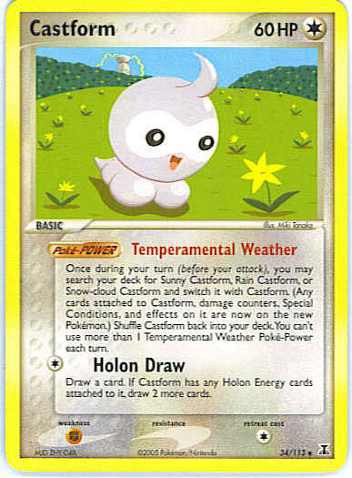 Type | Colorless | Pokemon serie | Delta Species | Stadie | Basic | HP | 60 | Sjældenhed | Uncommon | Tilbagetrækning | 1 | Svaghed | F | Kortnummer | 34 | Evne | on it are now on the new Pokemon.) Shuffle Castform back into your deck. You can't use more than 1 Temperamental Weather Poke-Power each turn. (Poke-POWER)