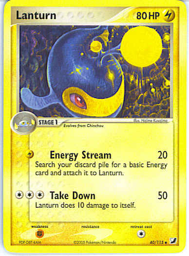 Type | Lightning | Pokemon serie | Unseen Forces | Stadie | Stage 1 | HP | 80 | Sjældenhed | Uncommon | Tilbagetrækning | 1 | Svaghed | F | Kortnummer | 40 | Evne | [L] Energy Stream (20) Search your discard pile for a basic Energy card and attach it to Lanturn. [CCC] Take Down (50) Lanturn does 10 damage to itself. | Evne2 | [L] Energy Stream (20) Search your discard pile for a basic Energy card and attach it to Lanturn. [CCC] Take Down (50) Lanturn does 10 damage to itself. | Kunstner | Hajime Kusajima |