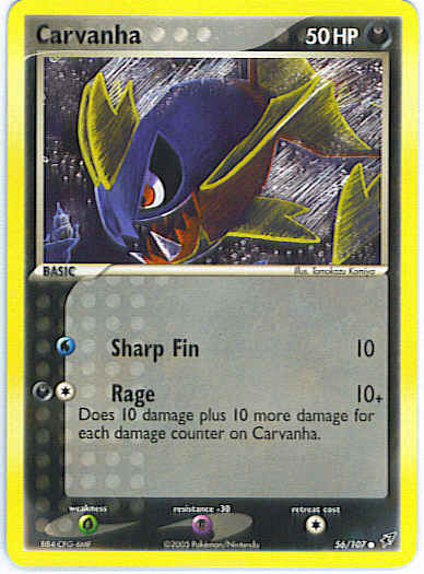 Type | Darkness | Pokemon serie | Deoxys | Stadie | Basic | HP | 50 | Sjældenhed | Common | Tilbagetrækning | 1 | Modstand | P | Svaghed | G | Kortnummer | 56 | Evne | [W] Sharp Fin (10) [CD] Rage (10+) Does 10 damage plus 10 more damage for each damage counter on Carvanha. | Evne2 | [W] Sharp Fin (10) [CD] Rage (10+) Does 10 damage plus 10 more damage for each damage counter on Carvanha. | Kunstner | Tomokazu Komiya |