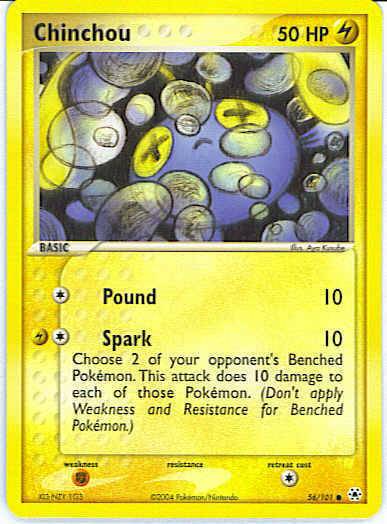 Type | Lightning | Pokemon serie | Hidden Legends | Stadie | Basic | HP | 50 | Sjældenhed | Common | Tilbagetrækning | 1 | Svaghed | F | Kortnummer | 56 | Evne | [C] Pound (10) [CL] Spark (10) Choose 2 of your opponent's Benched Pokemon. This attack does 10 damage to each of those Pokemon. (Don't apply Weakness and Resistance for Benched Pokemon.) | Evne2 | [C] Pound (10) [CL] Spark (10) Choose 2 of your opponent's Benched Pokemon. This attack does 10 damage to each of those Pokemon. (Don't apply Weakness and Resistance for Benched Pokemon.) | Kunstner | Aya Kusube |