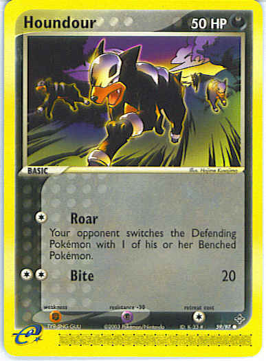 Type | Darkness | Pokemon serie | Dragon | Stadie | Basic | HP | 50 | Sjældenhed | Common | Tilbagetrækning | 1 | Modstand | P | Svaghed | F | Kortnummer | 59 | Evne | [C] Roar - Your opponent switches the Defending Pokemon with 1 of his or her Benched Pokemon. [CC] Bite (20) | Evne2 | [C] Roar - Your opponent switches the Defending Pokemon with 1 of his or her Benched Pokemon. [CC] Bite (20) | Kunstner | Hajime Kusajima |