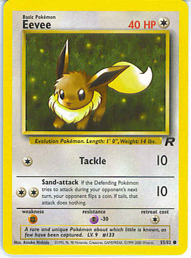 Type | Colorless | Pokemon serie | Team Rocket | Stadie | Basic | HP | 40 | Sjældenhed | Common | Tilbagetrækning | 1 | Modstand | P | Svaghed | F | Kortnummer | 55 | Evne |