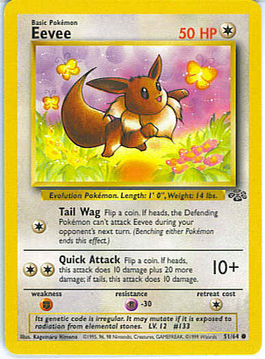 [C] Tail Wag - Flip a coin. If heads, the Defending Pokemon can't attack Eevee during your opponent's next turn. (Benching either Pokemon ends this effect.)