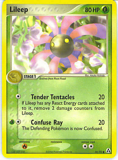 Type | Grass | Pokemon serie | Legend Maker | Stadie | Stage 1 | HP | 80 | Sjældenhed | Common | Tilbagetrækning | 2 | Svaghed | R | Kortnummer | 56 | Evne | [C] Tender Tentacles (20) If Lileep has any React Energy cards attached to it, remove 2 damage counters from Lileep. [CG] Confuse Ray (20) The Defending Pokemon is now Confused. | Evne2 | [C] Tender Tentacles (20) If Lileep has any React Energy cards attached to it, remove 2 damage counters from Lileep. [CG] Confuse Ray (20) The Defending Pokemon is now Confused. | Kunstner | Atsuko Nishida |