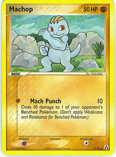 Type | Fighting | Pokemon serie | Legend Maker | Stadie | Basic | HP | 50 | Sjældenhed | Common | Tilbagetrækning | 1 | Svaghed | P | Kortnummer | 57 | Evne | [F] Mach Punch (10) Does 10 damage to 1 of your opponent's Benched Pokemon. (Don't apply Weakness and Resistance for Benched Pokemon.) | Evne2 | [F] Mach Punch (10) Does 10 damage to 1 of your opponent's Benched Pokemon. (Don't apply Weakness and Resistance for Benched Pokemon.) | Kunstner | Yukiko Baba |