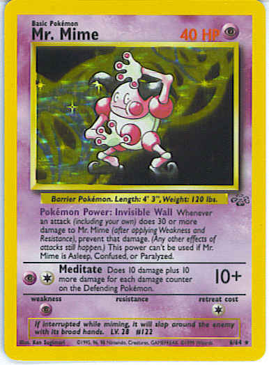 Type | Psychic | Pokemon serie | Jungle | Stadie | Basic | HP | 40 | Sjældenhed | Rare | Tilbagetrækning | 1 | Svaghed | P | Kortnummer | 6 | Evne | of attacks still happen.) This power can't be used if Mr. Mime is Asleep, Confused, or Paralyzed.