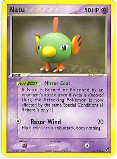Type | Psychic | Pokemon serie | Deoxys | Stadie | Basic | HP | 50 | Sjældenhed | Common | Tilbagetrækning | 1 | Svaghed | P | Kortnummer | 66 | Evne | [C] Razor Wind (20) Flip a coin. If tails, this attack does nothing. | Evne2 | [C] Razor Wind (20) Flip a coin. If tails, this attack does nothing. | Kunstner | Yuka Morii |