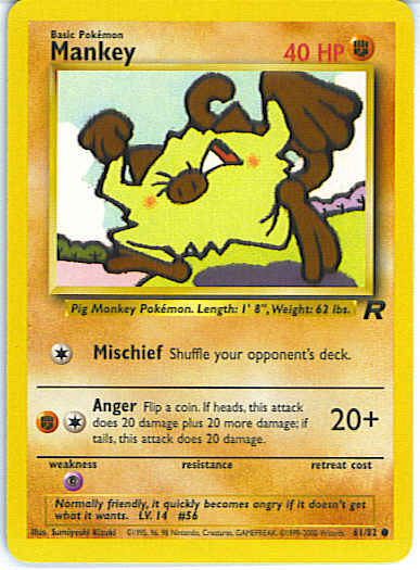 Type | Fighting | Pokemon serie | Team Rocket | Stadie | Basic | HP | 40 | Sjældenhed | Common | Svaghed | P | Kortnummer | 61 | Evne |