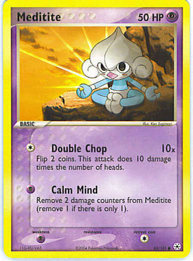 Type | Psychic | Pokemon serie | Hidden Legends | Stadie | Basic | HP | 50 | Sjældenhed | Common | Tilbagetrækning | 1 | Svaghed | P | Kortnummer | 65 | Evne | [C] Double Chop (10x) Flip 2 coins. This attack does 10 damage times the number of heads. [P] Calm Mind - Remove 2 damage counters from Meditite (remove 1 if there is only 1). | Evne2 | [C] Double Chop (10x) Flip 2 coins. This attack does 10 damage times the number of heads. [P] Calm Mind - Remove 2 damage counters from Meditite (remove 1 if there is only 1). | Kunstner | Ken Sugimori |