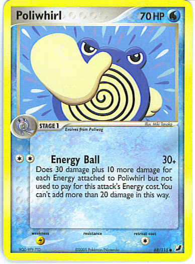 Type | Water | Pokemon serie | Unseen Forces | Stadie | Stage 1 | HP | 70 | Sjældenhed | Common | Tilbagetrækning | 1 | Svaghed | L | Kortnummer | 68 | Evne | [CC] Energy Ball (30+) Does 30 damage plus 10 more damage for each Energy attached to Poliwhirl but not used to pay for this attack's Energy cost. You can't add more than 20 damage in this way. | Evne2 | [CC] Energy Ball (30+) Does 30 damage plus 10 more damage for each Energy attached to Poliwhirl but not used to pay for this attack's Energy cost. You can't add more than 20 damage in this way. | Kunstner | Miki Tanaka |
