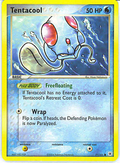 Type | Water | Pokemon serie | Hidden Legends | Stadie | Basic | HP | 50 | Sjældenhed | Common | Tilbagetrækning | 1 | Svaghed | L | Kortnummer | 77 | Evne | [C] Wrap - Flip a coin. If heads, the Defending Pokemon is now Paralyzed. | Evne2 | [C] Wrap - Flip a coin. If heads, the Defending Pokemon is now Paralyzed. | Kunstner | Hisao Nakamura |