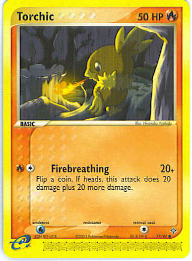 Type | Fire | Pokemon serie | Dragon | Stadie | Basic | HP | 50 | Sjældenhed | Common | Tilbagetrækning | 1 | Svaghed | W | Kortnummer | 77 | Evne | [CR] Firebreathing (20+) Flip a coin. If heads, this attack does 20 damage plus 20 more damage. | Evne2 | [CR] Firebreathing (20+) Flip a coin. If heads, this attack does 20 damage plus 20 more damage. | Kunstner | Hironobu Yoshida |