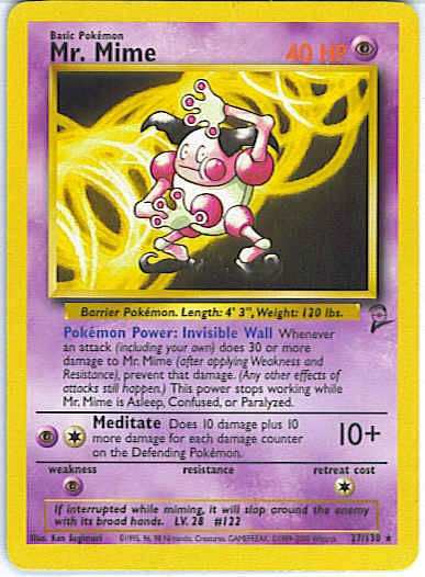 Type | Psychic | Pokemon serie | Base Set 2 | Stadie | Basic | HP | 40 | Sjældenhed | Rare | Tilbagetrækning | 1 | Svaghed | P | Kortnummer | 27 | Evne | of attacks still happen.) This power can't be used if Mr. Mime is Asleep, Confused, or Paralyzed.