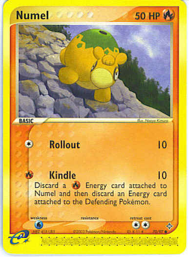 Type | Fire | Pokemon serie | Dragon | Stadie | Basic | HP | 50 | Sjældenhed | Common | Tilbagetrækning | 2 | Svaghed | W | Kortnummer | 70 | Evne | [C] Rollout (10) [R] Kindle (10) Discard a R Energy card attached to Numel and then discard an Energy card attached to the Defending Pokemon. | Evne2 | [C] Rollout (10) [R] Kindle (10) Discard a R Energy card attached to Numel and then discard an Energy card attached to the Defending Pokemon. | Kunstner | Naoyo Kimura |