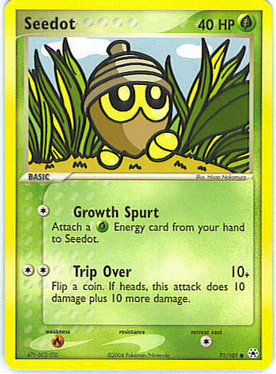 Type | Grass | Pokemon serie | Hidden Legends | Stadie | Basic | HP | 40 | Sjældenhed | Common | Tilbagetrækning | 1 | Svaghed | R | Kortnummer | 71 | Evne | [C] Growth Spurt - Attach a G Energy card from your hand to Seedot. [CC] Trip Over (10+) Flip a coin. If heads, this attack does 10 damage plus 10 more damage. | Evne2 | [C] Growth Spurt - Attach a G Energy card from your hand to Seedot. [CC] Trip Over (10+) Flip a coin. If heads, this attack does 10 damage plus 10 more damage. | Kunstner | Hisao Nakamura |