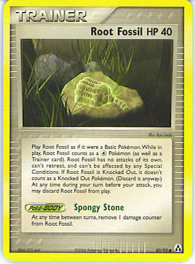 Play Root Fossil as if it were a Basic Pokemon. While in play, Root Fossil counts as a C Pokemon (as well as a Trainer card). Root Fossil has no attacks of it's own, can't retreat, and can't be affected by any Special Conditions. If Root Fossil is Knocked Out, it doesn't count as a Knocked Out Pokemon. (Discard it anyway.) At any time during your turn before your attack, you may discard Root Fossil from play.