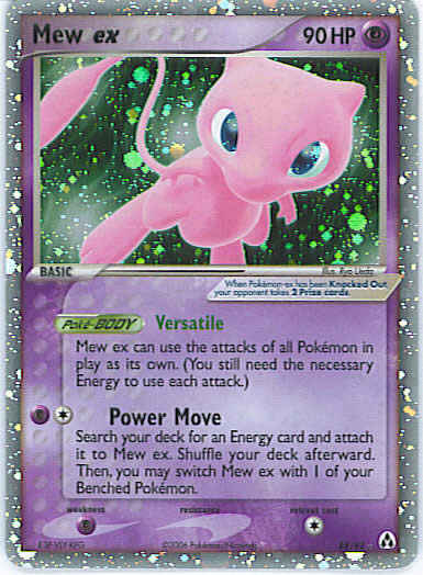 Type | Psychic | Pokemon serie | Legend Maker | Stadie | Basic | HP | 90 | Sjældenhed | Ultra-Rare | Tilbagetrækning | 1 | Svaghed | P | Kortnummer | 88 | Evne | [CP] Power Move - Search your deck for an Energy card and attach it to Mew ex. Shuffle your deck afterward. Then, you may switch Mew ex with 1 of your Benched Pokemon. | Evne2 | [CP] Power Move - Search your deck for an Energy card and attach it to Mew ex. Shuffle your deck afterward. Then, you may switch Mew ex with 1 of your Benched Pokemon. | Kunstner | Ryo Ueda |
