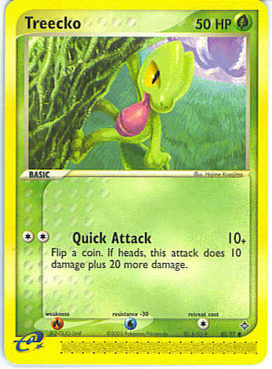 Type | Grass | Pokemon serie | Dragon | Stadie | Basic | HP | 50 | Sjældenhed | Common | Tilbagetrækning | 1 | Modstand | W | Svaghed | R | Kortnummer | 80 | Evne | [CC] Quick Attack (10+) Flip a coin. If heads, this attack does 10 damage plus 20 more damage. | Evne2 | [CC] Quick Attack (10+) Flip a coin. If heads, this attack does 10 damage plus 20 more damage. | Kunstner | Hajime Kusajima |