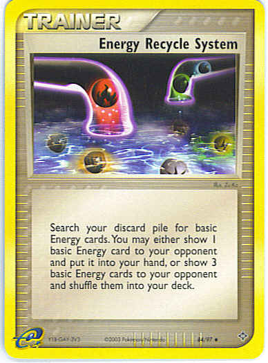 Search your discard pile for basic Energy cards. You may either show 1 basic Energy card to your opponent and put it into your hand, or show 3 basic Energy cards to your opponent and shuffle them into your deck.