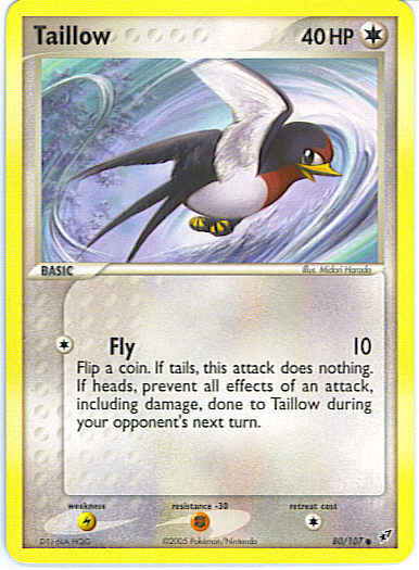 Type | Colorless | Pokemon serie | Deoxys | Stadie | Basic | HP | 40 | Sjældenhed | Common | Tilbagetrækning | 1 | Modstand | F | Svaghed | L | Kortnummer | 80 | Evne | [C] Fly (10) Flip a coin. If tails, this attack does nothing. If heads, prevent all effects of an attack, including damage, done to Tallow during your opponent's next turn. | Evne2 | [C] Fly (10) Flip a coin. If tails, this attack does nothing. If heads, prevent all effects of an attack, including damage, done to Tallow during your opponent's next turn. | Kunstner | Midori Harada |