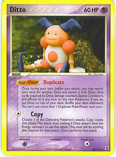 Type | Psychic | Pokemon serie | Delta Species | Stadie | Basic | HP | 60 | Sjældenhed | Uncommon | Tilbagetrækning | 1 | Svaghed | P | Kortnummer | 38 | Evne | on it are now on the new Pokemon.) If you do, put Ditto on top of your deck. Shuffle your deck afterward. You can't use more than 1 Duplicate Poke-Power each turn. (Poke-POWER)