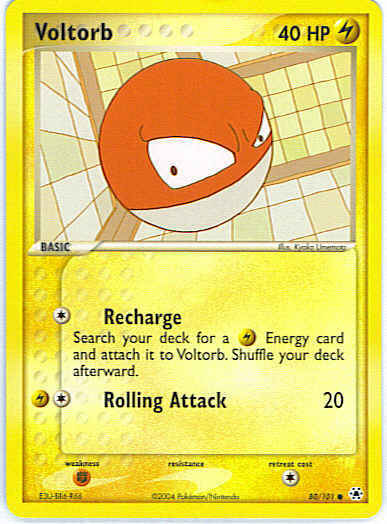 Type | Lightning | Pokemon serie | Hidden Legends | Stadie | Basic | HP | 40 | Sjældenhed | Common | Tilbagetrækning | 1 | Svaghed | F | Kortnummer | 80 | Evne | [C] Recharge - Search your deck for a L Energy card and attach it to Voltorb. Shuffle your deck afterward. [CL] Rolling Attack (20) | Evne2 | [C] Recharge - Search your deck for a L Energy card and attach it to Voltorb. Shuffle your deck afterward. [CL] Rolling Attack (20) | Kunstner | Kyoko Umemoto |