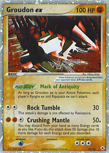 Type | Fighting | Pokemon serie | Hidden Legends | Stadie | Basic | HP | 100 | Sjældenhed | Ultra-Rare | Tilbagetrækning | 3 | Svaghed | W | Kortnummer | 93 | Evne | [CC] Rock Tumble (30) This attack's damage is not affected by Resistance. [CFF] Crushing Mantle (50+) You may discard from your hand as many Energy cards as you like. If you do, this attack does 50 damage plus 10 more damage for each Energy card you discarded. | Evne2 | [CC] Rock Tumble (30) This attack's damage is not affected by Resistance. [CFF] Crushing Mantle (50+) You may discard from your hand as many Energy cards as you like. If you do, this attack does 50 damage plus 10 more damage for each Energy card you discarded. | Kunstner | Hikaru Koike |