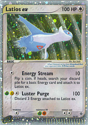 Type | Colorless | Pokemon serie | Dragon | Stadie | Basic | HP | 100 | Sjældenhed | Ultra-Rare | Tilbagetrækning | 2 | Modstand | FG | Svaghed | C | Kortnummer | 94 | Evne | [C] Energy Stream (10) Flip a coin. If heads, search your discard pile for a basic Energy card and attach it to Latios ex. [CGL] Luster Purge (100) Discard 3 Energy attached to Latios ex. | Evne2 | [C] Energy Stream (10) Flip a coin. If heads, search your discard pile for a basic Energy card and attach it to Latios ex. [CGL] Luster Purge (100) Discard 3 Energy attached to Latios ex. | Kunstner | Ryo Ueda |